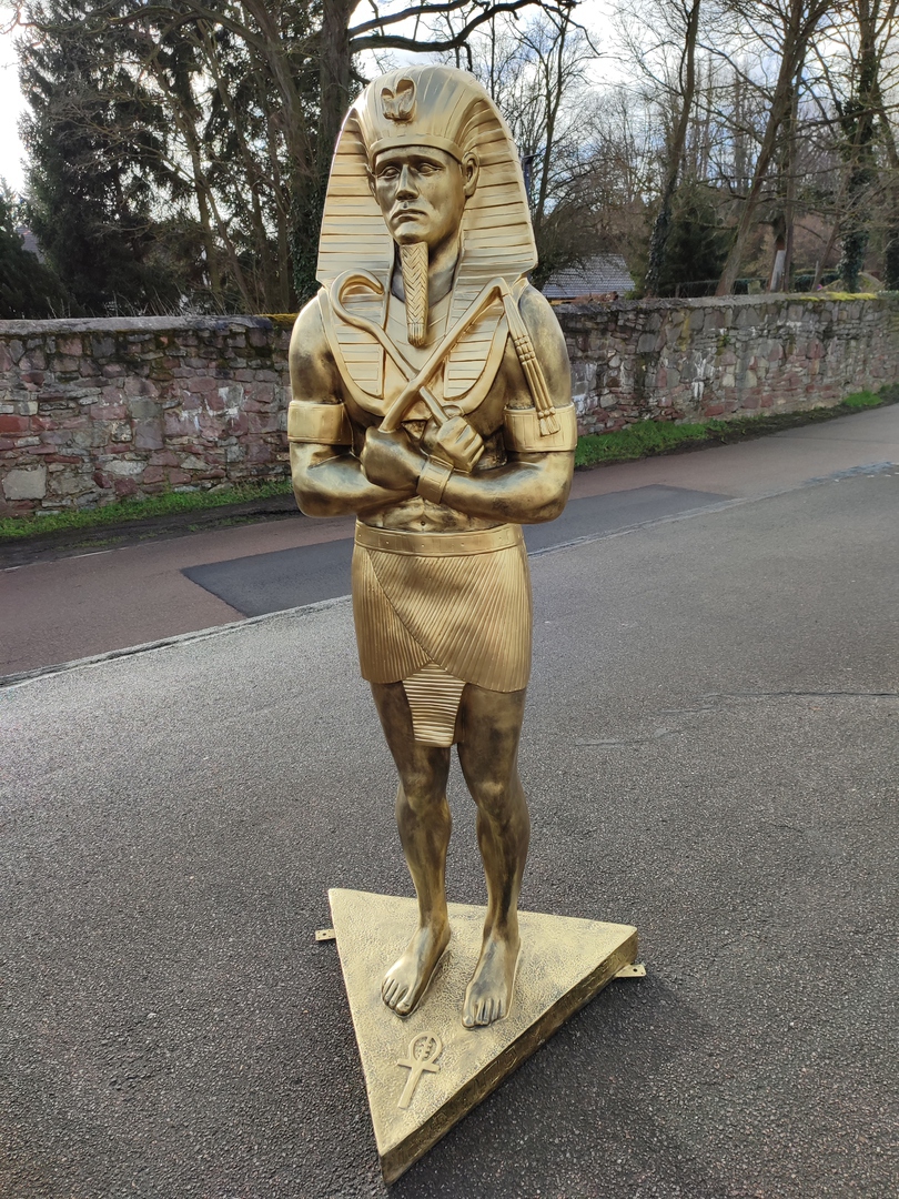 Die lebensgrosse ägyptische Statue von Pharao Ramses, hier ganz in Gold ist eine schöne Deko draussen im Garten, auf dem Balkon oder der Terrasse, aber auch drinnen in der Wohnung.