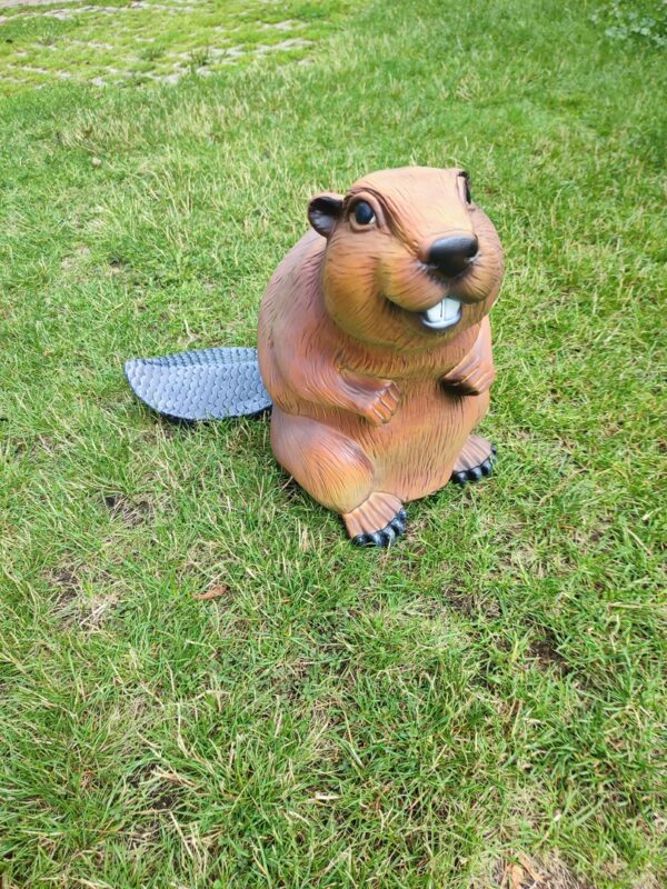 Die sitzende Biberfigur für den Garten ist eine hübsche Deko auch auf dem Balkon oder der Terrasse, oder als Inndendekoration in der Wohnung.