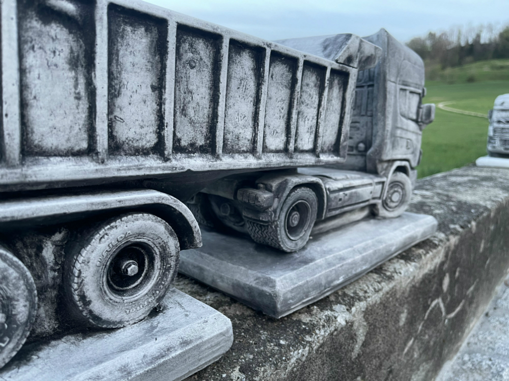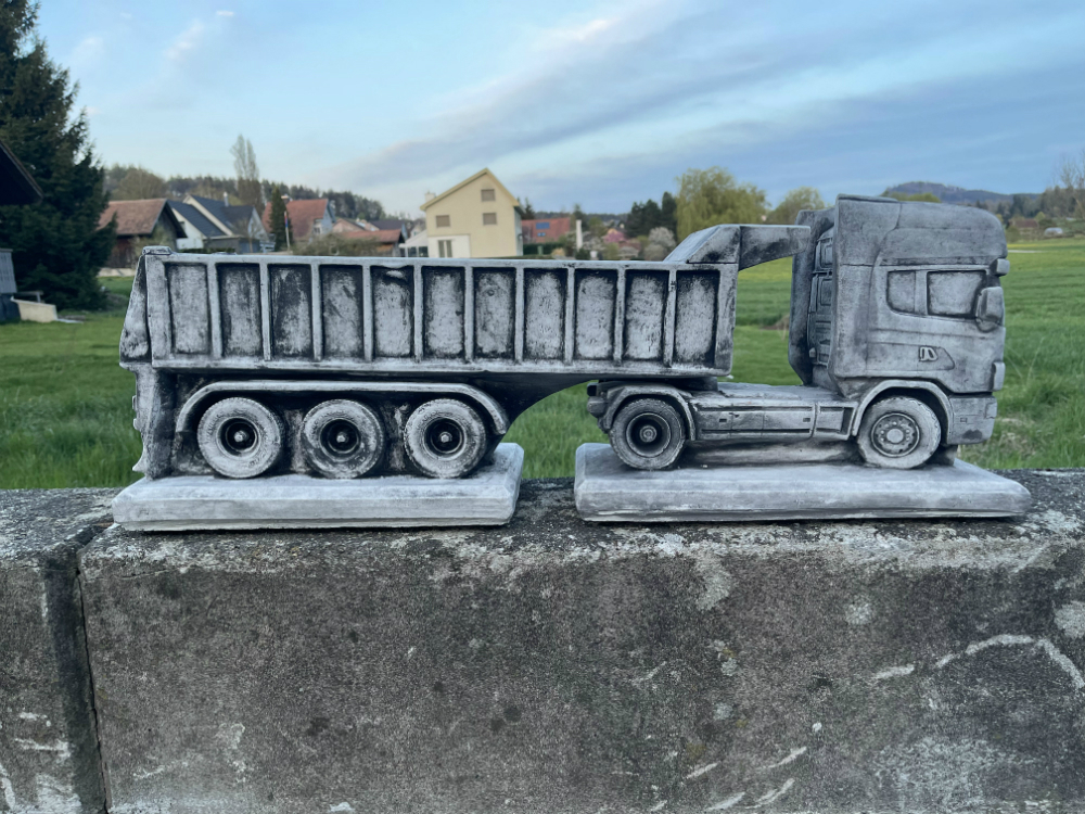 Blumentopf aus Beton, LKW Scania mit Kippmuldenauflieger