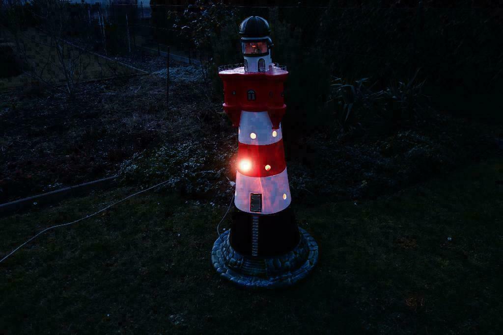 Erhellt wird dieses Leuchtfeuer mit einer 230V Beleuchtung, die im Feuerhaus über einen Wechselschalter ein auf- und abhellendes Licht simuliert und einem Standlicht, das die offenen Luken im Turm erhellt.