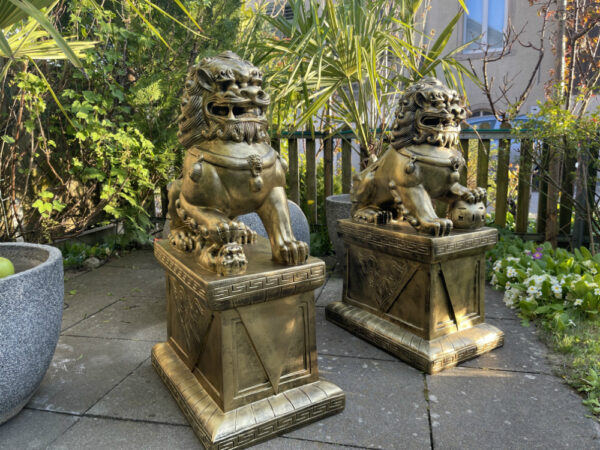 Gartenfiguren chinesische Wächterlöwen auf einem Podest, für Ihre Gartendeko, auch für den Balkon, die Terrasse oder drinnen als Innendeko.