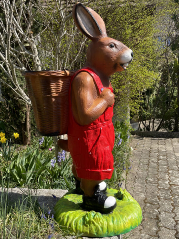 Die grosse Hasenfigur ist eine auffällige Erscheinung, wie sie da so im Garten steht. Schon aufgrund ihrer Grösse zieht sie die Blicke auf sich. Wenn man die Kiepe noch ausschmückt und so seine eigene Note hinzu gibt wird daraus eine einzigartige Gartendeko.