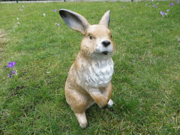 Der Dekohase schaut sich aufmerksam um. Eine schöne Dekofigur für den Garten. Auch auf dem Balkon, auf der Terrasse und als Innendeko in der Wohnung schön anzuschauen.