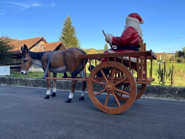 Der lesende Samichlaus mit Esel und Wagen ist eine einzigartige Weihnachtsdeko im Garten oder auf der Terrasse.