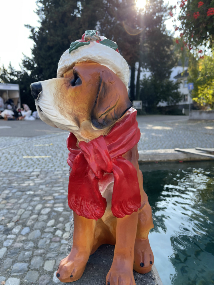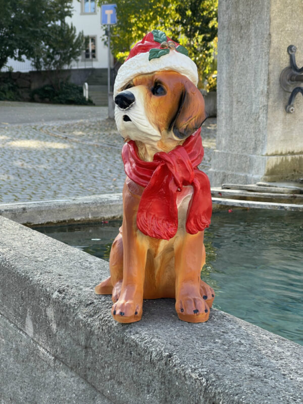 Der Hund mit der Klausmütze verschönert auch jede Weihnachtsdekoration im Laden, im Schaufenster, im Restaurant oder bei Weihnachtsanlässen.